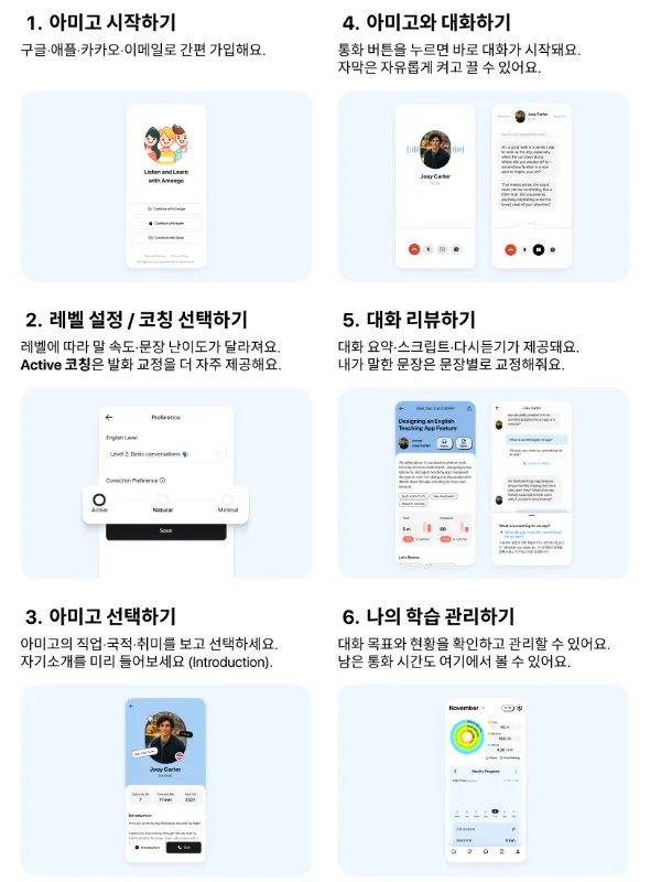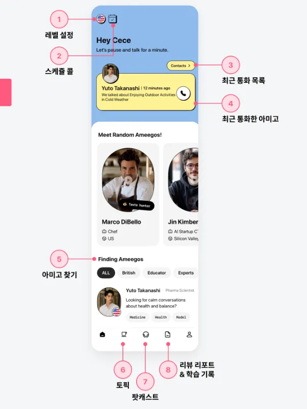 친근한 개발자, 재미난 여행가, 냉정한 회계사, 요가 선생님까지! 각기 다른 국적, 직업, 취미, 말투를 가진 아미고를 만나보세요. 목소리부터 대화까지 마치 실제 사람과 이야기하는 것처럼 느껴질 거예요.
